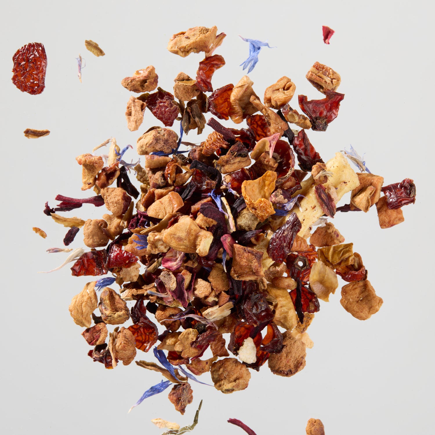 Zutaten: APPLE PIECES*, ROSEHIP PEELS*, HIBISCUS FLOWERS*, WHITE HIBISCUS FLOWERS*, PINEAPPLE CHIPS*, NATURAL CITRUS FLAVOR, CITRUS PEELS*, CORNFLOWER PETALS*, CITRUS OIL*