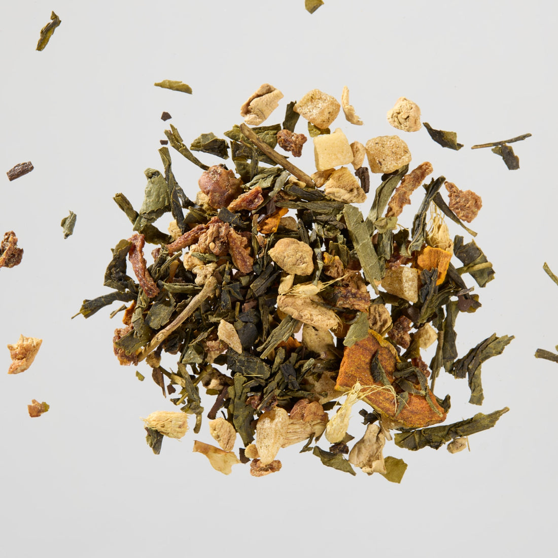 Grüntee und Mate sorgen für gleichmäßige Wachheit, Ingwer und Zitrus bringen Frische und Klarheit.